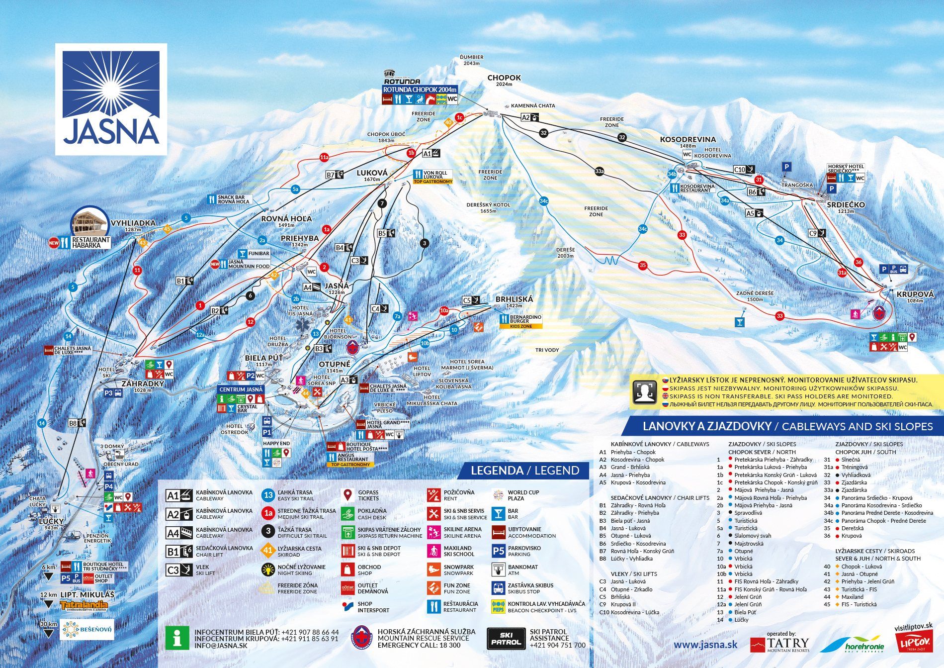 Największy w tej części Europy ośrodek narciarski – Jasna Tatry Niżne: Chopok (2024 m n.p.m.), 49 km tras – 11 km czarnych nartostrad dla zaawansowanych, niemal 26 km dla średnio zaawansowanych i 12 km łatwych, niebieskich tras; 30 km nartostrad naśnieżanych 5 miesięcy w roku; 30 wyciągów i kolejek linowych (w tym 5 gondolowych), które są w stanie przetransportować prawie 35 000 osób na godzinę. Pierwszego dnia odwiedzimy stoki w ośrodku narciarskim: Ski Park Kubińska Hola, 14 km tras, 2 wyciągi krzesełkowe, 8 wyciągów orczykowych lub Park Snow Donovaly, 11 km tras, 2 wyciągi krzesełkowe, 14 wyciągów orczykowych